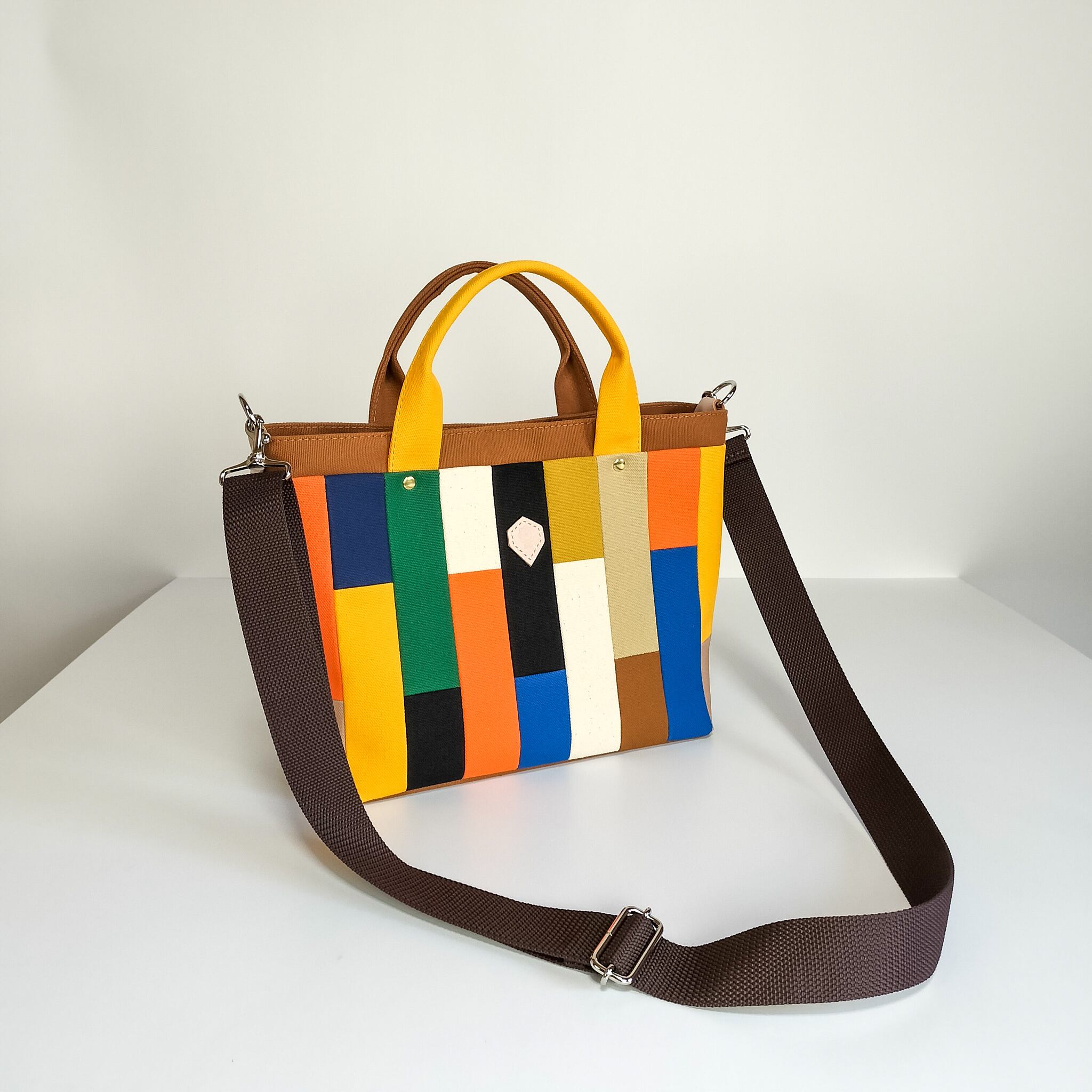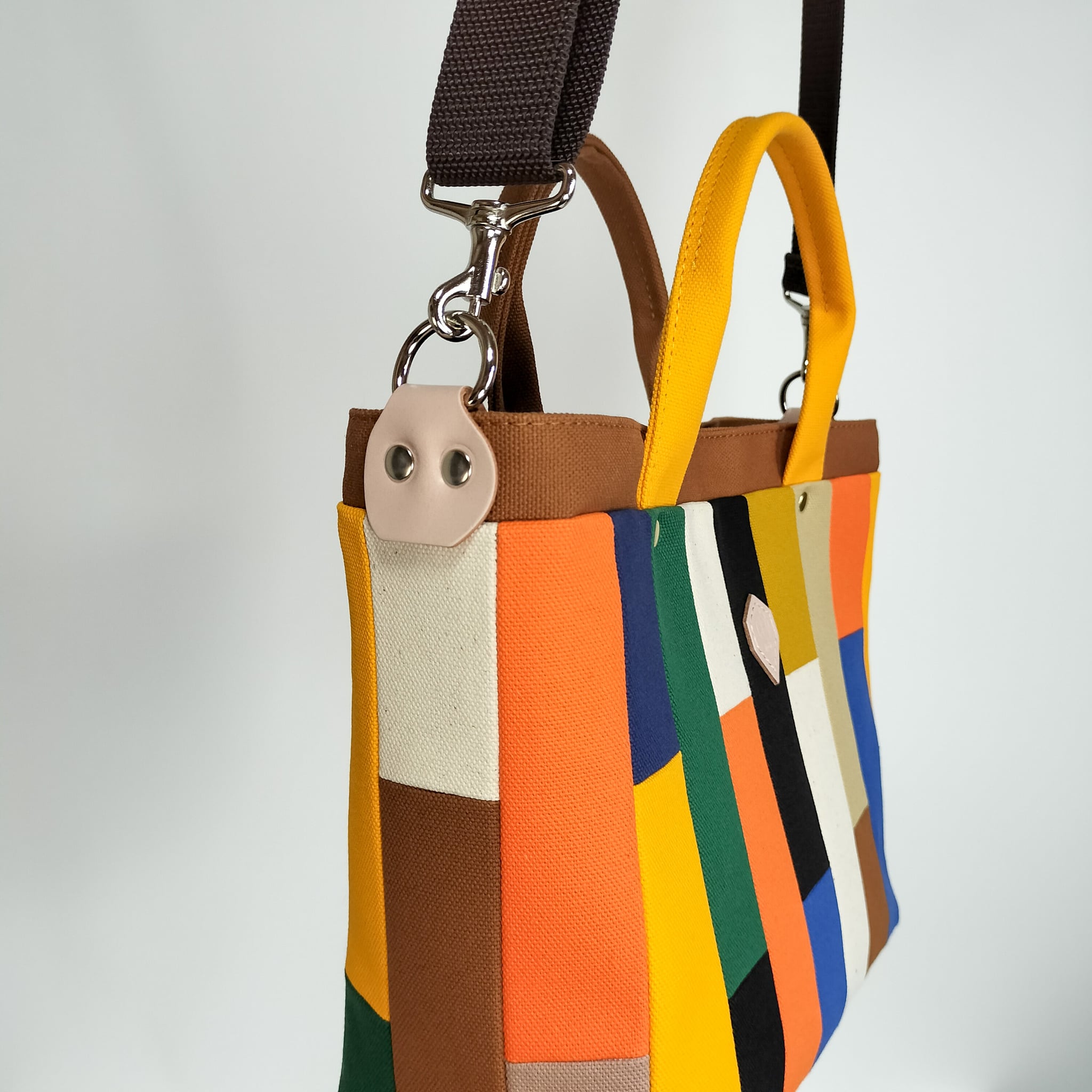 トートバッグの両端にDカンを取り付け、金具で取り外し可能・長さ調節可能なショルダーベルトをお付けします。