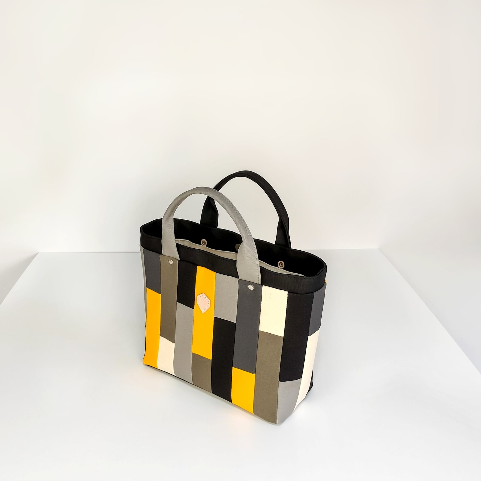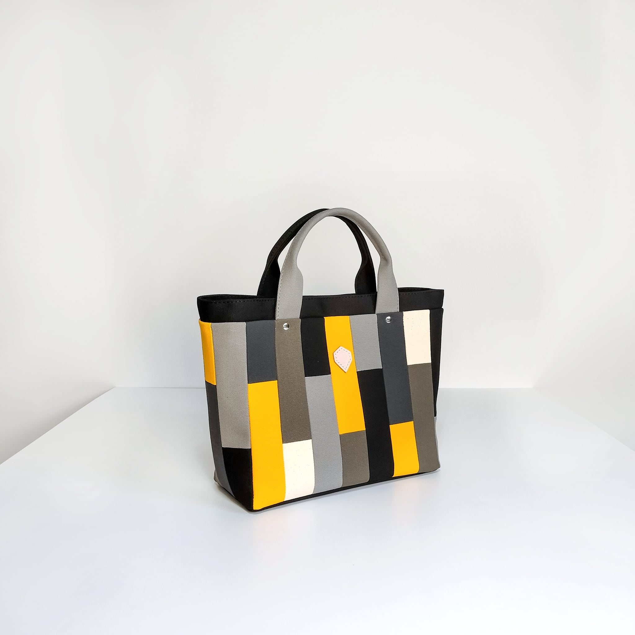 トーンの異なるグレーを合わせたモノトーンにアクセントカラーのイエローが入ったモザイク柄は、小さく裁断した生地を一枚一枚縫い合わせています。