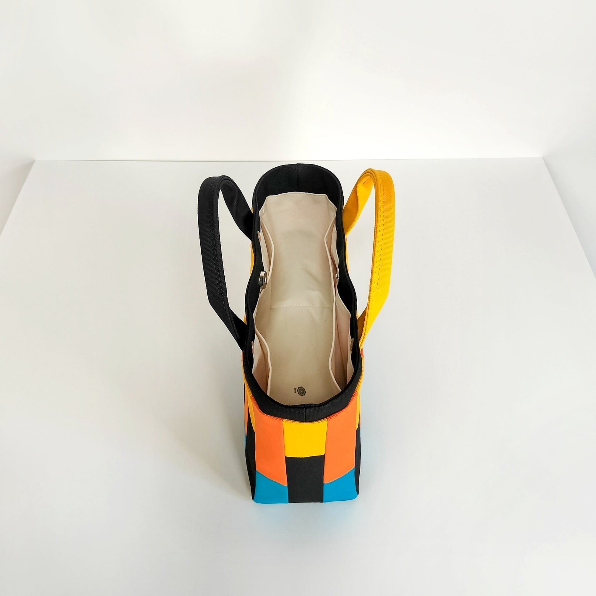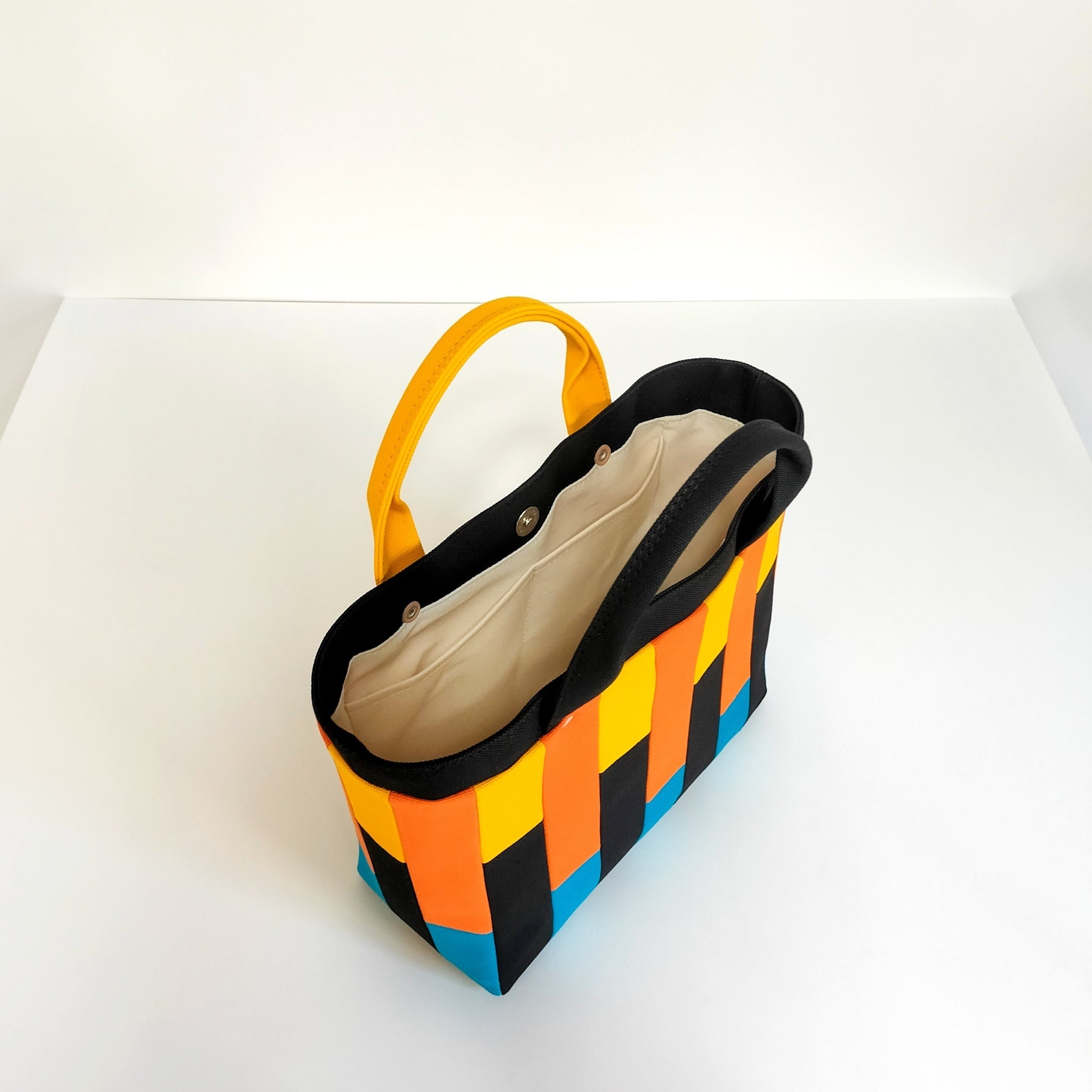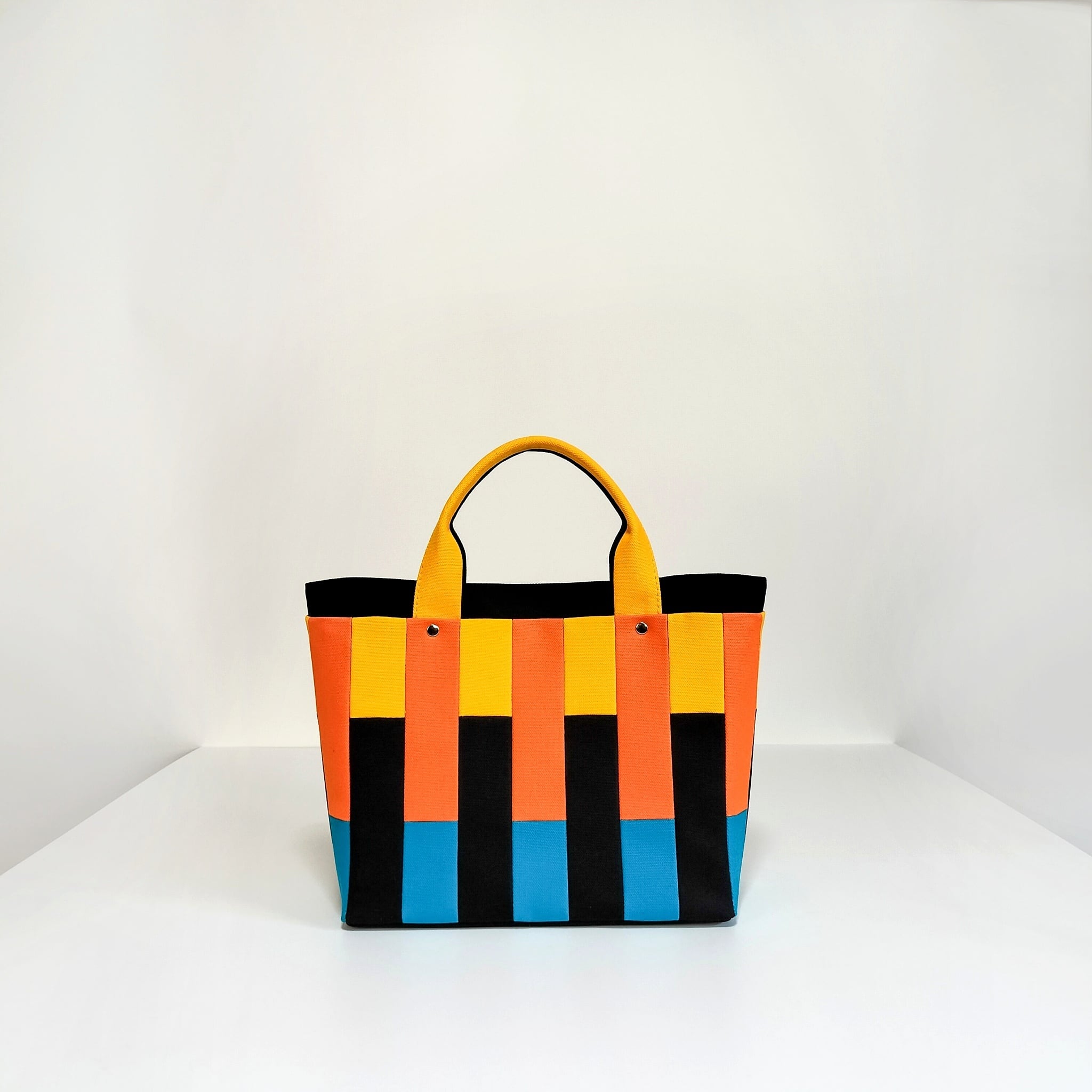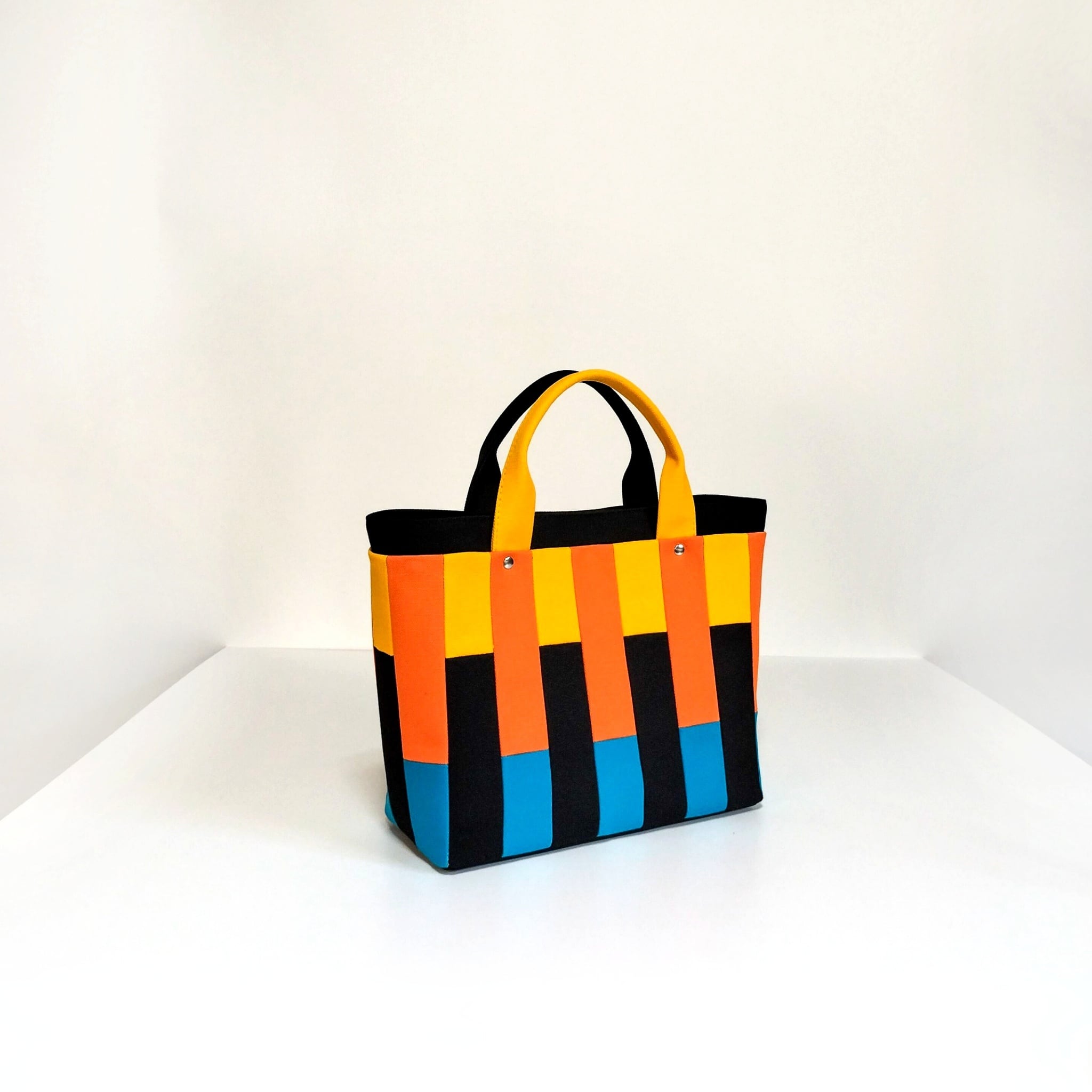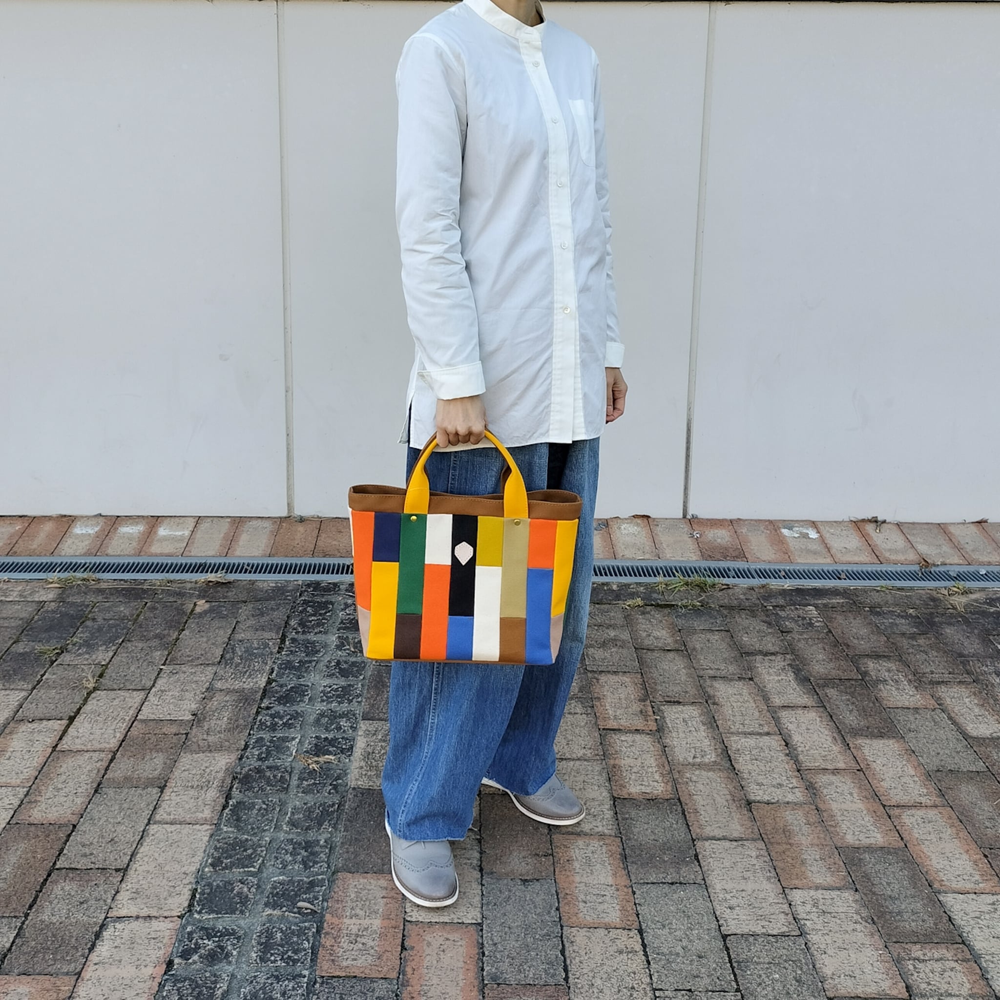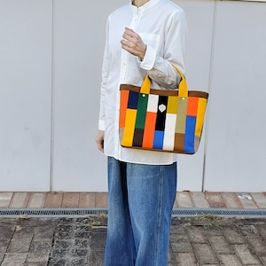 鮮やかな色遣いが楽しいモザイク柄は、小さく裁断した色とりどりの帆布生地を一枚一枚縫い合わせています。