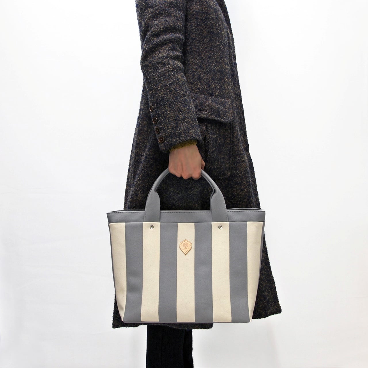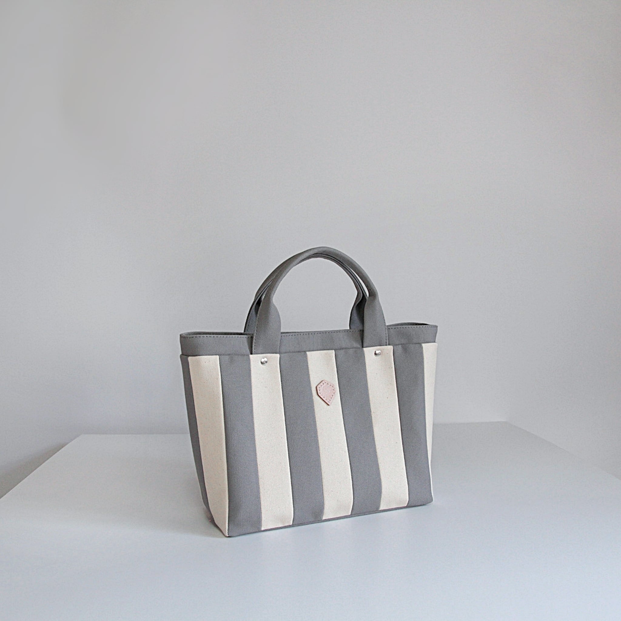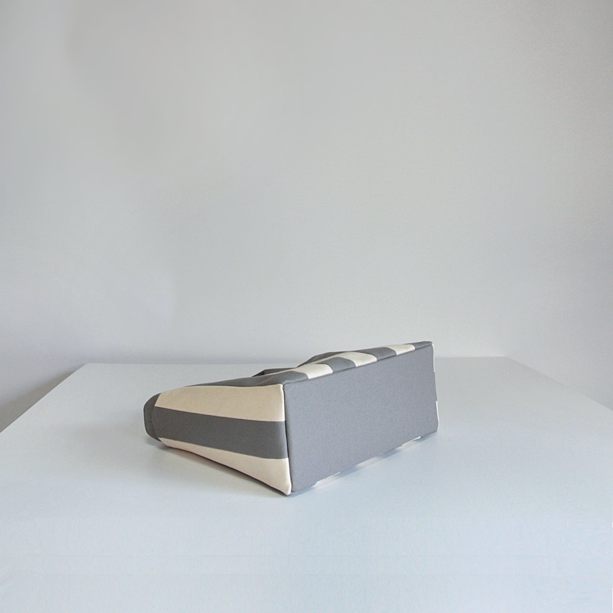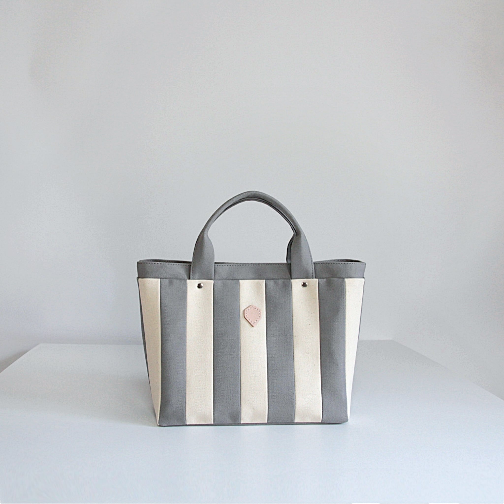 帆布生地をストライプに縫い合わせたトートバッグ。