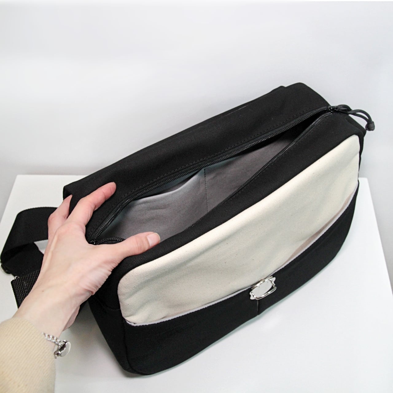 口は両開きのファスナー付きでしっかり閉じられ安心です。