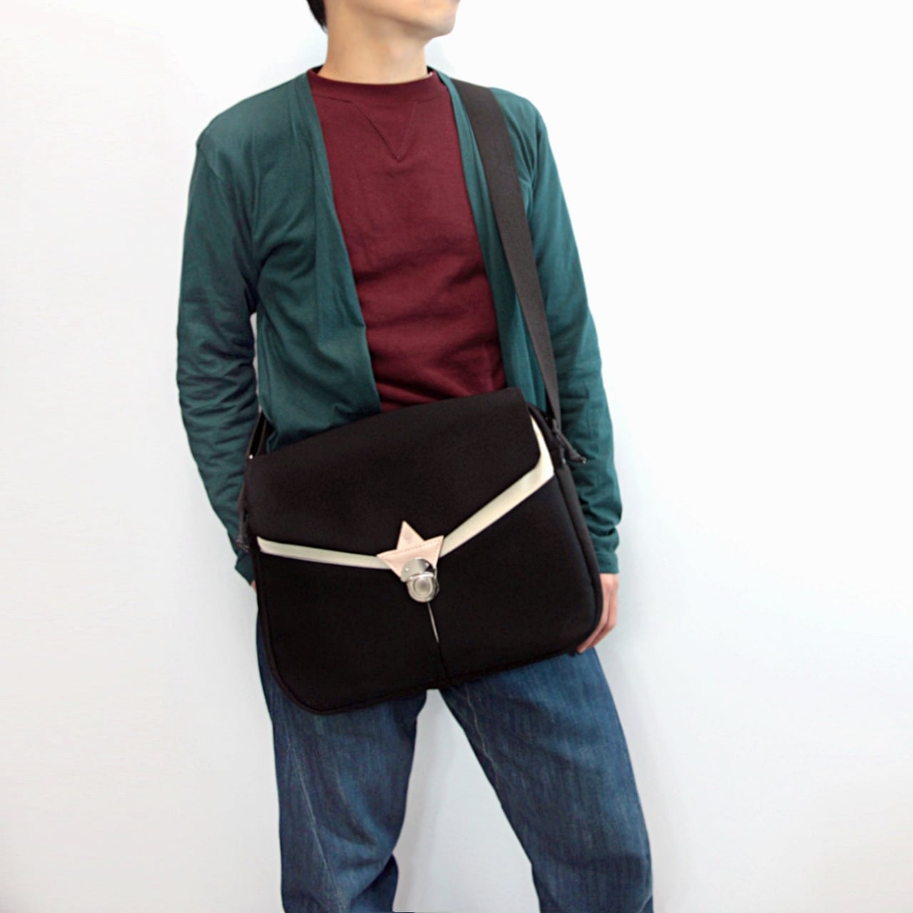 丈夫なショルダーベルトは長さ調節可能、適度な幅があるので肩に負担がかかりにくく、斜め掛けした時に体にフィットします。