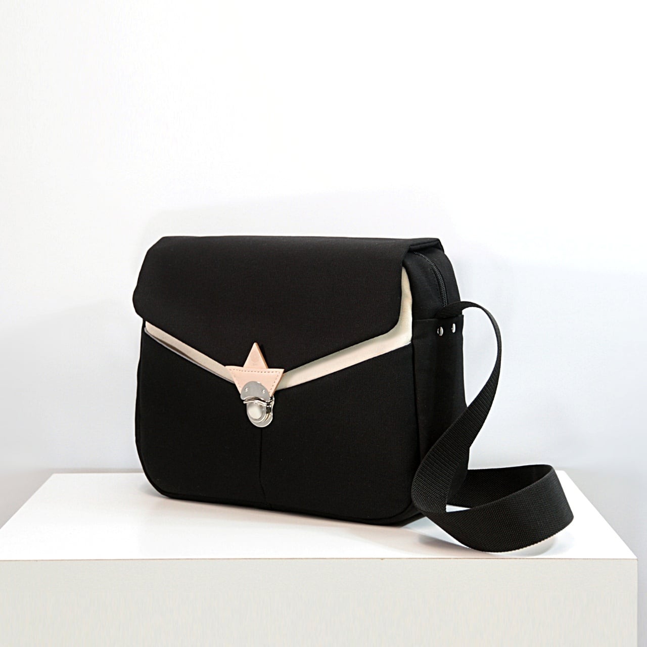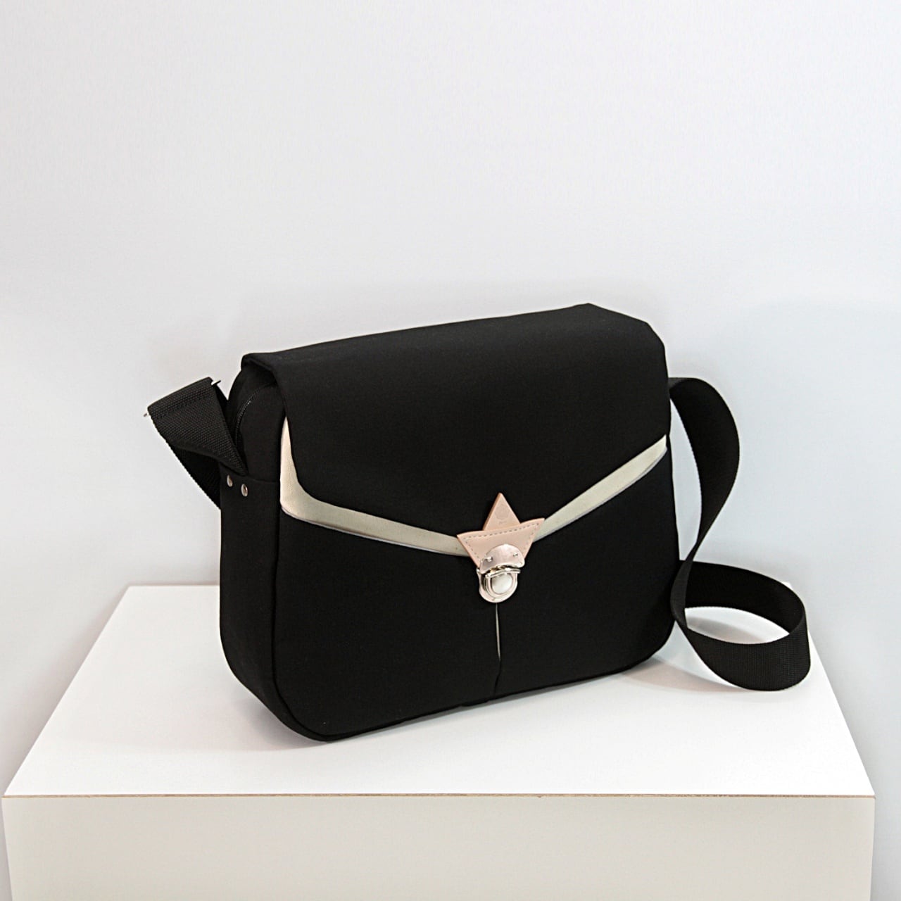 縫い目をなるべく表に出さないことでやわらかい表情を出し、フタの留め具に開け閉めのしやすい差込錠を採用、舟形のレザーパーツと合わせてデザインのアクセントにもなっています。