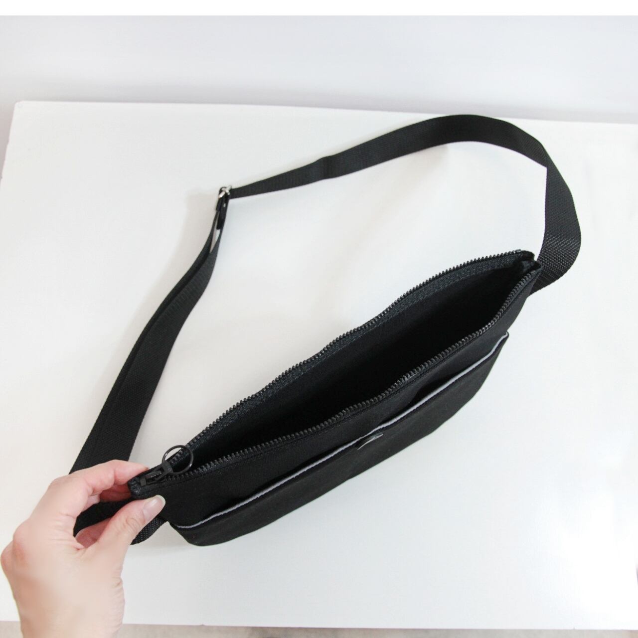 長財布やタブレットも入るサイズで、口はファスナー付き、外ポケットが2つついています。